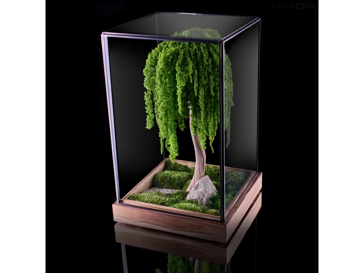 Questo è un bonsai di salice piangente stabilizzato all'interno di una teca in vetro e legno.