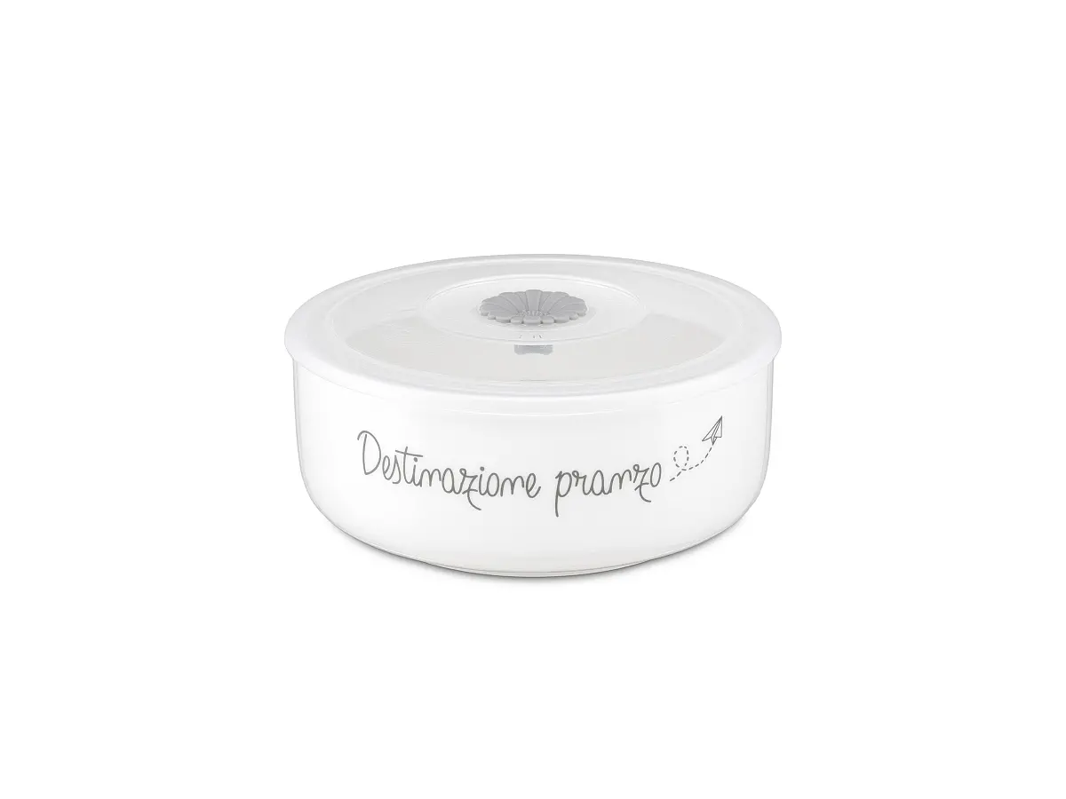 Ciotola pranzo della linea “Gli Onesti” in porcellana di alta qualità, ideale per servire piatti unici, zuppe e preparazioni complete. Il diametro di 15,5 cm la rende perfetta per porzioni generose, mentre il pratico coperchio aiuta a mantenere i cibi freschi e protetti.