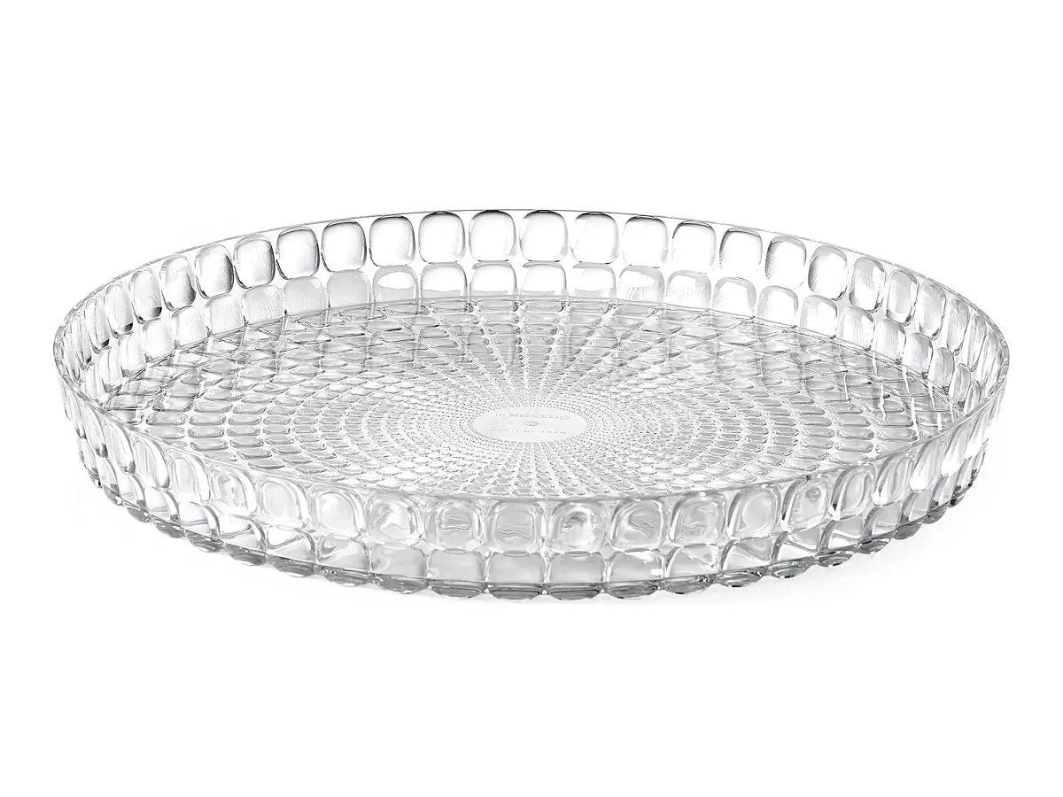 Vassoio realizzato in pregiato materiale plastico trasparente e colorato, questo vassoio circolare si distingue per i suoi eleganti effetti scintillanti.